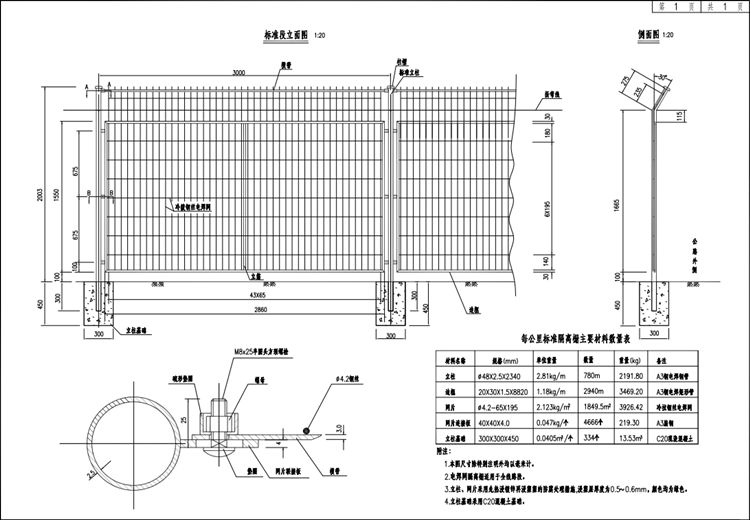 焊接网隔离栅采用直径4mm钢丝焊制,网片规格75×150mm。其力学性能应符合 YB/T 5294-2009的规定。焊接网隔离栅立柱采用φ48 立柱。立柱与挂钩点焊固定成整体后采用先镀锌后浸塑防腐处理,钢丝网片镀锌防腐,镀锌量应高于 120g/㎡,立柱设 C20 混凝土基础。 隔离栅立柱、斜撑等镀锌量应高于450g/㎡。