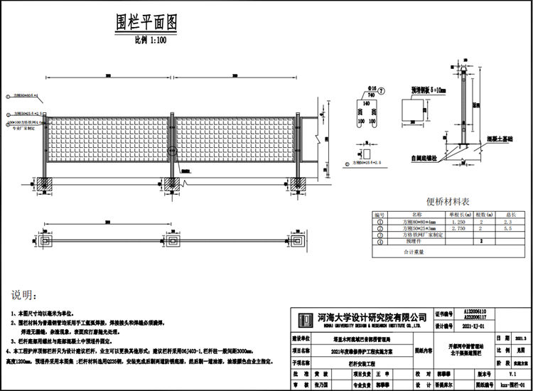 4、本工程护岸顶部栏杆只为设计建议栏杆,业主可以更换其他形式;建议栏杆采用06J403-1, 栏杆柱一般间距3000mm,高度1200m,预埋件采用本图集;栏杆材料选用Q235钢,安装完成后刷两道防锈底漆,然后刷一道油漆,油漆颜色由业主指定。