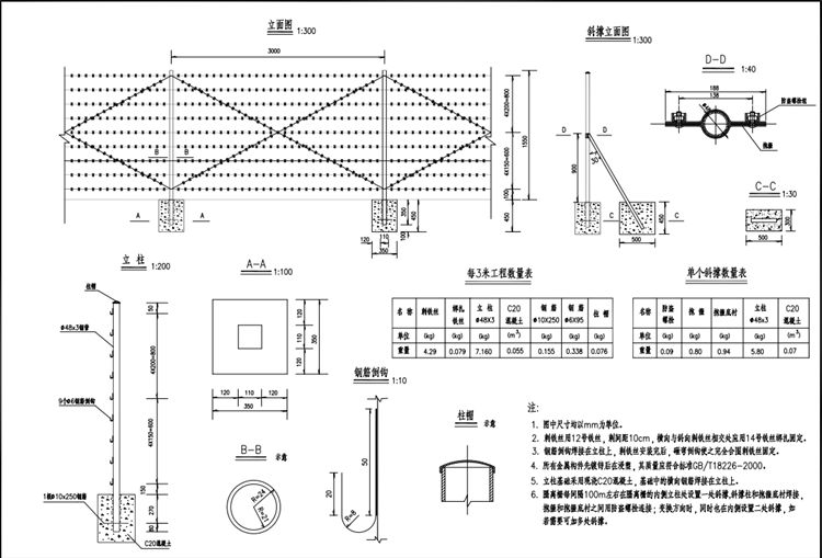 全线除天然屏障处(河流、沟渠等),其余地方(包括旱桥部分)均连续设置结构合理、美观大方的刺铁丝隔离栅。一般路段采用刺铁丝隔离栅。刺铁丝隔离栅应设在路基两侧用地界碑内0.3米处,地形有起伏时,刺铁丝隔离栅按阶梯形设置;刺铁丝隔离栅遇到≤3米的沟渠或涵洞时,可采用直接经过;每段刺铁丝隔离栅的起终点或刺铁丝隔离栅需要断开的地方,应针对不同的情况做端头围封,在刺铁丝隔离栅需改变方向的地方,应做拐角处理。刺铁丝隔离栅基础预制施工。为满足公路、桥梁和通道等养护管理的需要,可在适当位置设置便于开启以满足车辆或人员进出的刺铁丝隔离栅活动门,刺铁丝隔离栅的立柱需要根据活动门的大小和开启情况进行加强。刺铁丝隔离栅的钢构件均应做热浸镀锌防腐处理。镀锌时应符合下表的规定,热浸镀锌所用的锌应为符合《高速公路交通工程钢构件防腐技术条件》中引用的GB/T470中所规定的0号或1号锌锭。镀锌后再镀塑,颜色为果绿色。