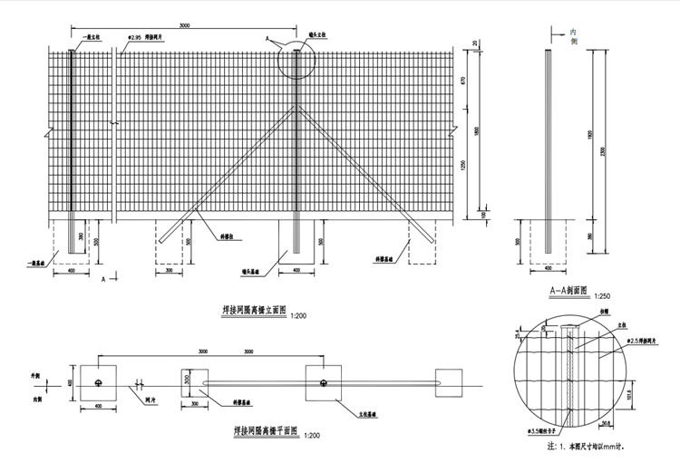2.焊接网隔离栅立柱及斜撑基础为现浇C20混凝土。
