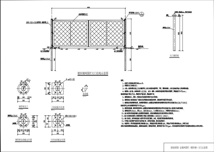 1.本图镀锌钢网围栏大门尺寸单位除注明外均以mm计。