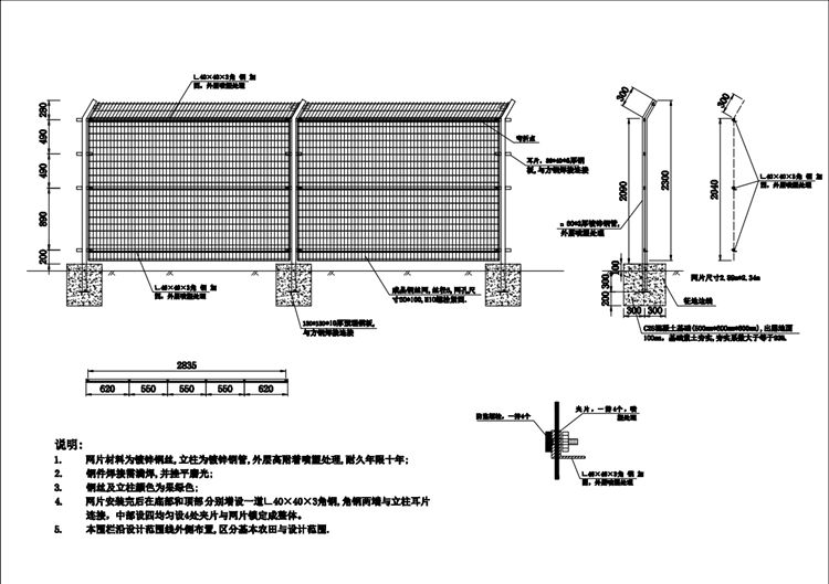 4.网片安装完后在底部和顶部分别增设一道L40X40X3角钢,角钢两端与立柱耳片连接,中部均匀设4处夹片与网片锁定成整体。