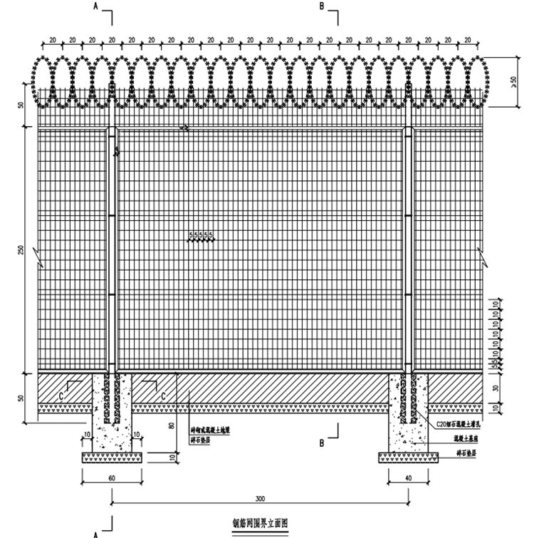 3.钢筋网与刺铁丝高度、规格:高2.5m(不含刺笼),采用Φ50斧型刺刀圈,直径50cm,间距20cm;详细规格要求见设计说明。