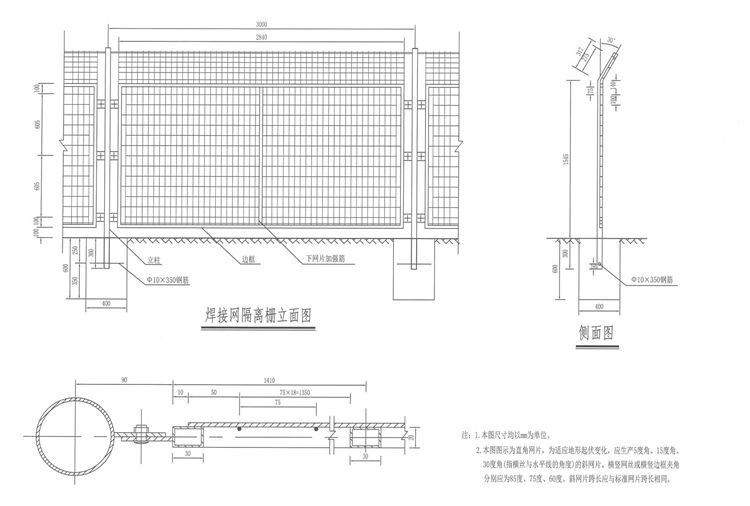 焊接网隔离栅(热浸镀锌+浸塑)立柱间距3m, 所有钢构件均采用Q235钢,其力学性能应符合相关规范要求;施焊前要求各单体矫正平直并去除毛刺;焊接部位要求过度圆滑、无夹渣、虚焊、气孔等焊接缺陷;构件组焊成型后需进行整体矫正,整形后的整体曲翘度不得大于7mm; 钢管钢板等镀锌量为275g/㎡,紧固件、连接件为120g/㎡。涂塑层厚度应大于0.25mm.钢丝>0.15mm。具体参见《公路交通工程钢构件防腐蚀技术条件》(CBVT 18226-2015)。