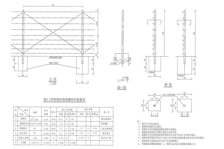 刺钢丝网隔离栅采用圆钢管立柱。刺丝采用12号低碳钢丝或低合金钢丝制作,应符合《一般用途低碳钢丝》(CB343)。《一般用途热镀锌低碳钢丝》的规定。刺钢丝网隔离栅立柱、斜撑、门柱采用先镀锌后浸塑方式,镀锌量不得低于275g/㎡,紧固件、连接件为120g/㎡, 涂塑层厚度应大于0.25mm.具体参见《公路交通工程钢构件防腐蚀技术条件》(GB/T 18226-2015)。