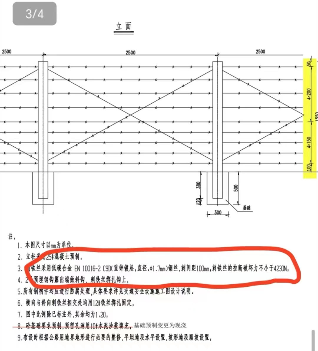 3、刺铁丝采用低碳合金EN10016-2C90(重锌镀层,Φ1.7mm)钢丝,刺间距100mm,刺铁丝的拉断破坏力不小于4230N。