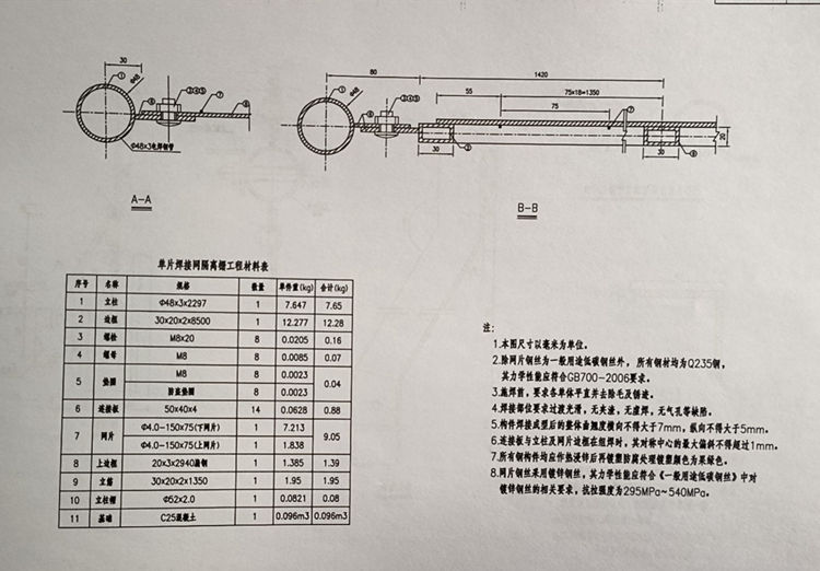 3.除网片钢丝为一般用途低碳钢丝外,所有钢材均为Q235钢,其力学性能应符合GB700-2006要求。