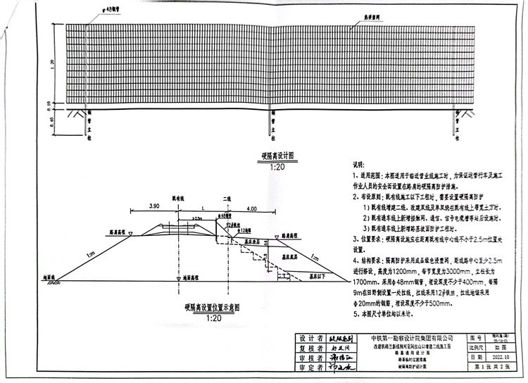 1.适用范围:本图适用于临近营业线施工时,为保证运营行车及施工作业人员的安全而设置在路肩的硬隔离防护措施。