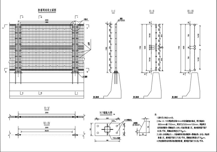 3.桥梁防落网立柱(含柱脚法兰)、压接钢带采用热浸镀锌+聚酯涂层(白色)双涂层防腐工艺,镀锌量不低于270克/㎡,聚酯涂层厚度大于76μm。