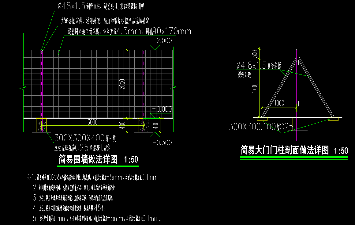 5、浸塑网围栏立柱尺寸偏差正1mm,柱子顶部设置防雨帽,网孔尺寸偏差±5mm,丝径尺寸偏差正0.1mm。