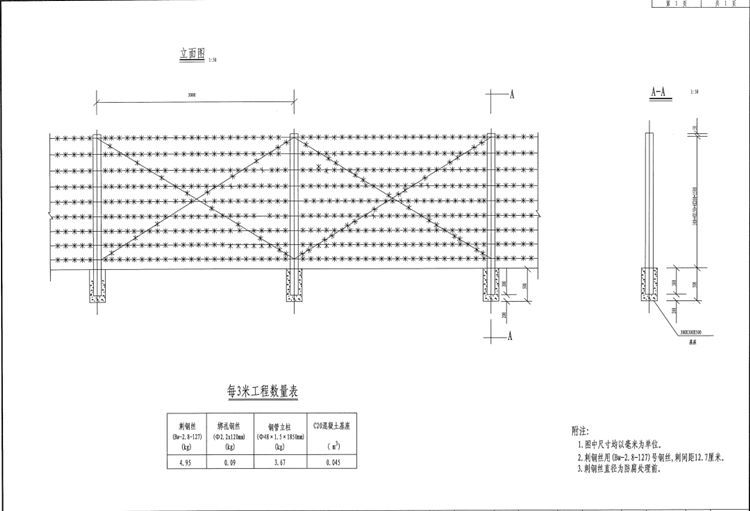 本路实行封闭,为防止人畜随意进入公路,保证车辆快速行驶和行车安全,保护公路设施的安全及公路用地不被任意侵犯,在沿线两侧人畜可能进入的地方,于公路用地界线内侧30cm处,连续设置隔离栅进行隔离封闭。地形有起伏时,刺钢丝隔离栅按阶梯形设置。刺钢丝隔离栅遇到≤2.5m的沟渠或涵洞时,可采用直接经过。每段刺钢丝隔离栅的起终点或隔离栅需要断开的地方,应针对不同的情况做端头围封,在刺钢丝隔离栅需改变方向的地方,应做拐角处理。除了跨越河、湖或较深的沟壑等天然屏障外,均设置刺钢丝隔离栅。刺钢丝隔离栅在桥头、通道口等处均采用严格的封闭措施,不留间隙,防止人畜从该处穿过。在跨越小河沟、小渠时,刺钢丝隔离栅与水面之间距离如果太大(≥15cm),则应采取补救措施。镀锌刺钢丝隔离栅立柱采用120*120水泥立柱,间距为3m,高出地面1.55m,刺钢丝采用Bw-2.8-127号,刺间距127mm。刺尖高25.4mm,刺丝由冷拉钢丝材质制作而成。表面先热浸镀锌,后浸塑而成。刺钢丝隔离栅钢构件采用技术条件应符合《碳素结构钢技术条件》(GB700-88) 之规定,立柱均应加盖柱帽,里外热浸镀锌,后表层喷塑而成。钢构件、刺铁丝均应做热浸镀锌涂塑防腐处理,镀锌时应符合《公路交通工程钢构件防腐技术条件》(GB/T 18226-2015)之规定。颜色采用果绿色,色号可采用6012或6010。