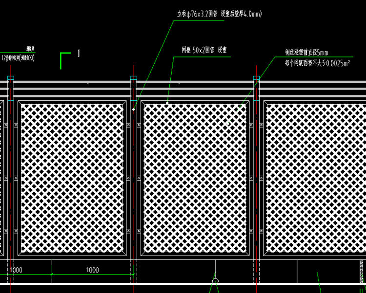 2、钢板网护栏网立柱间距1.5m,采用电焊管,其化学成分及机械性能应符合有关规定,焊接部位要求过度圆滑,无夹缝,无虚焊无气孔等缺陷。
