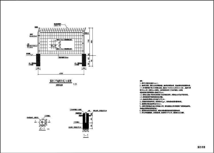 9.本图所示热浸塑围栏网做法仅为施工参考的施工方案,最终应根据业主所订货的热浸塑围栏网厂家提供的基础形式、详细做法及热浸塑围栏网的花型等进行施工。