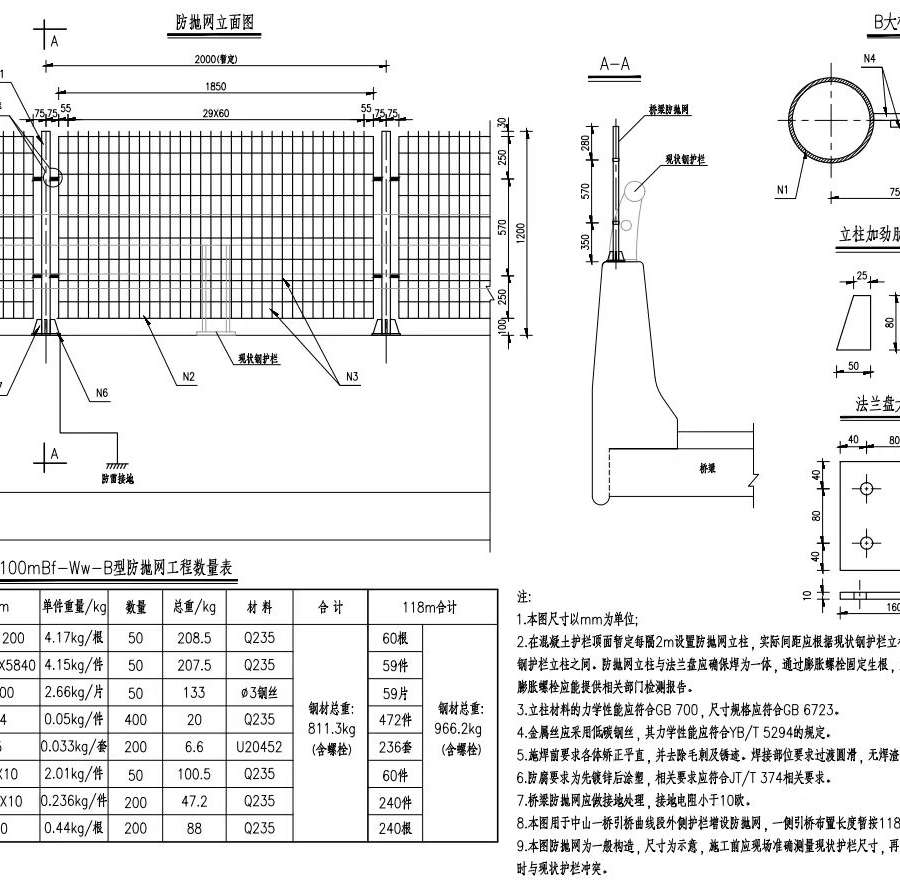 8.本图用于中山一桥引桥曲线段外侧护栏增设防抛网,一侧引桥布置长度暂按118m计。