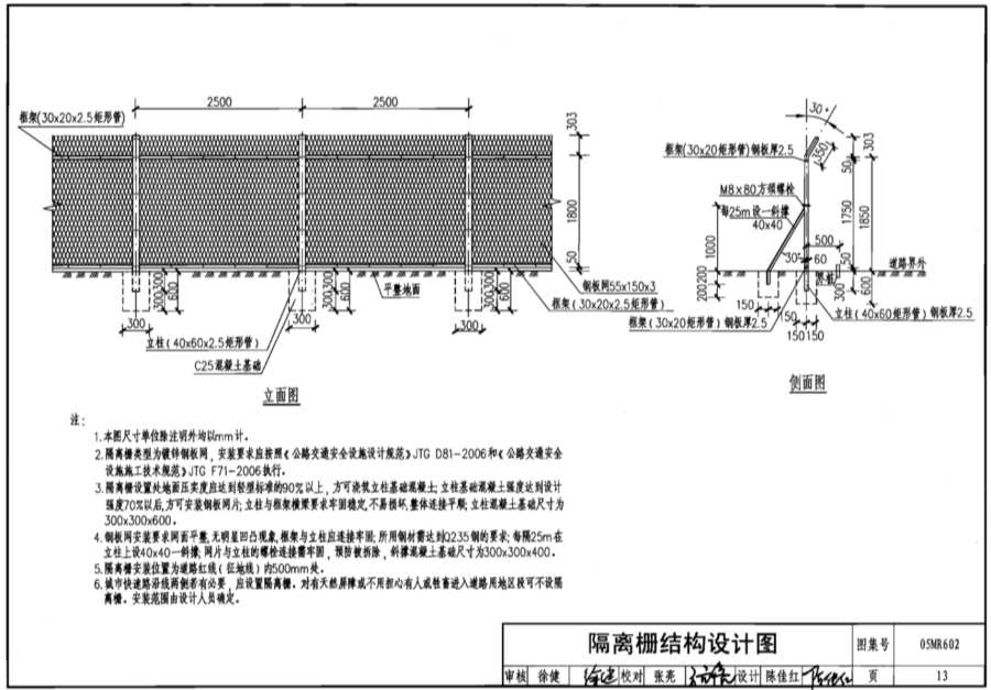 5.隔离栅安装位置为道路红线(征地线)内500mm处。