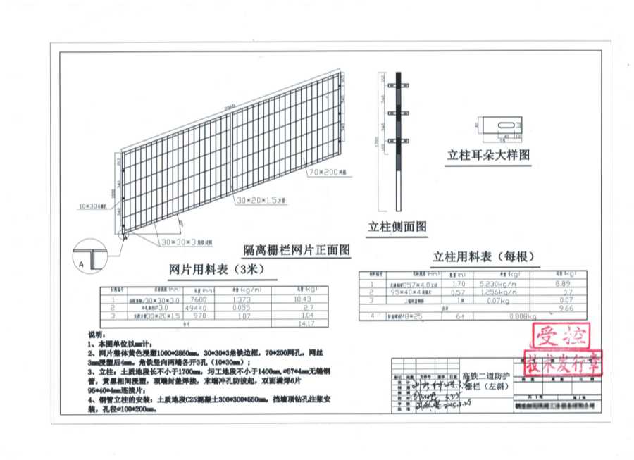2、网片整体黄色漫塑1000*2860mm,30*30*3角铁边框,70*200网孔,网丝3mm浸塑后4mm。角铁竖向两端各开3孔(10*30mm)。